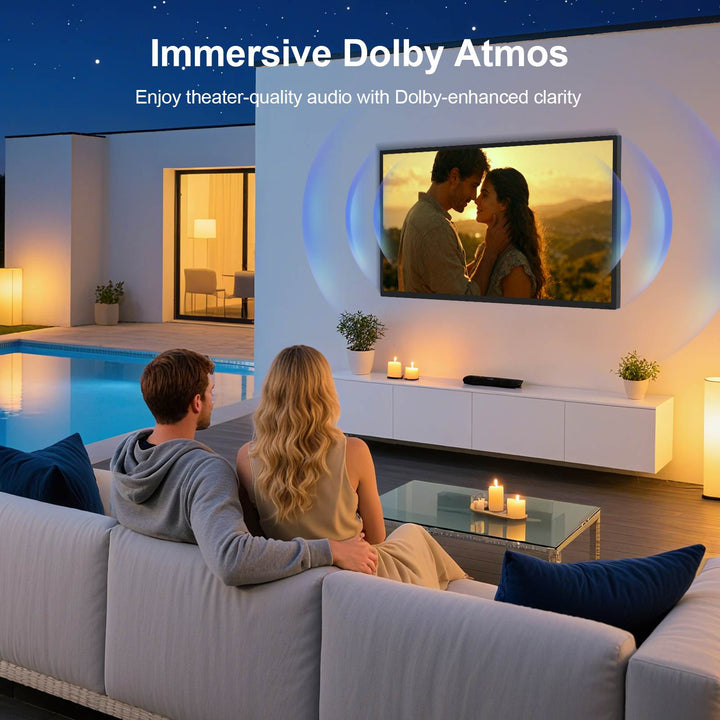 Enjoy lifelike 4K UHD visuals and rich Dolby Atmos sound. HDR10 enhances color and contrast for a true cinematic experience outdoors.